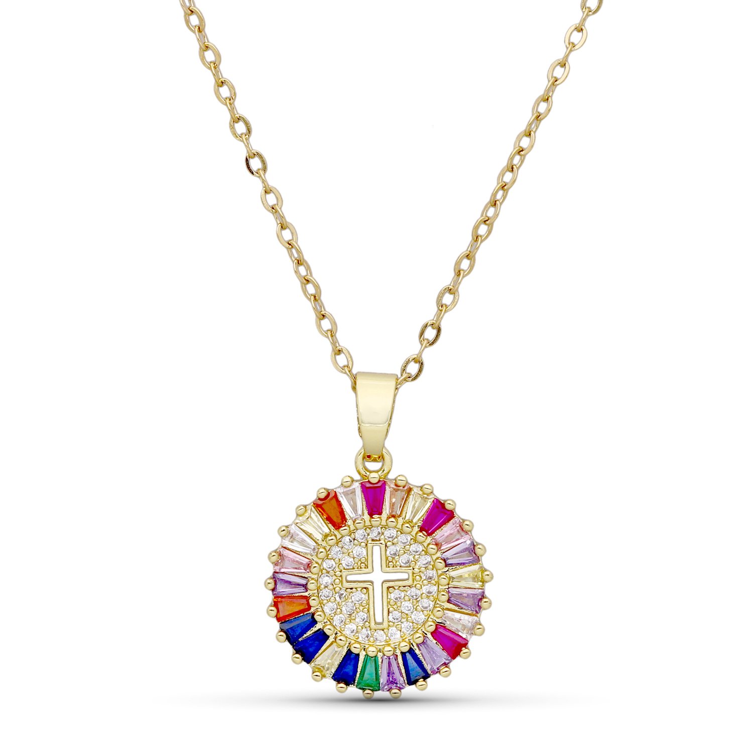Colgante acero chapado oro con cruz y piedras de colores cadena en 50cm el colgante mide 18mm