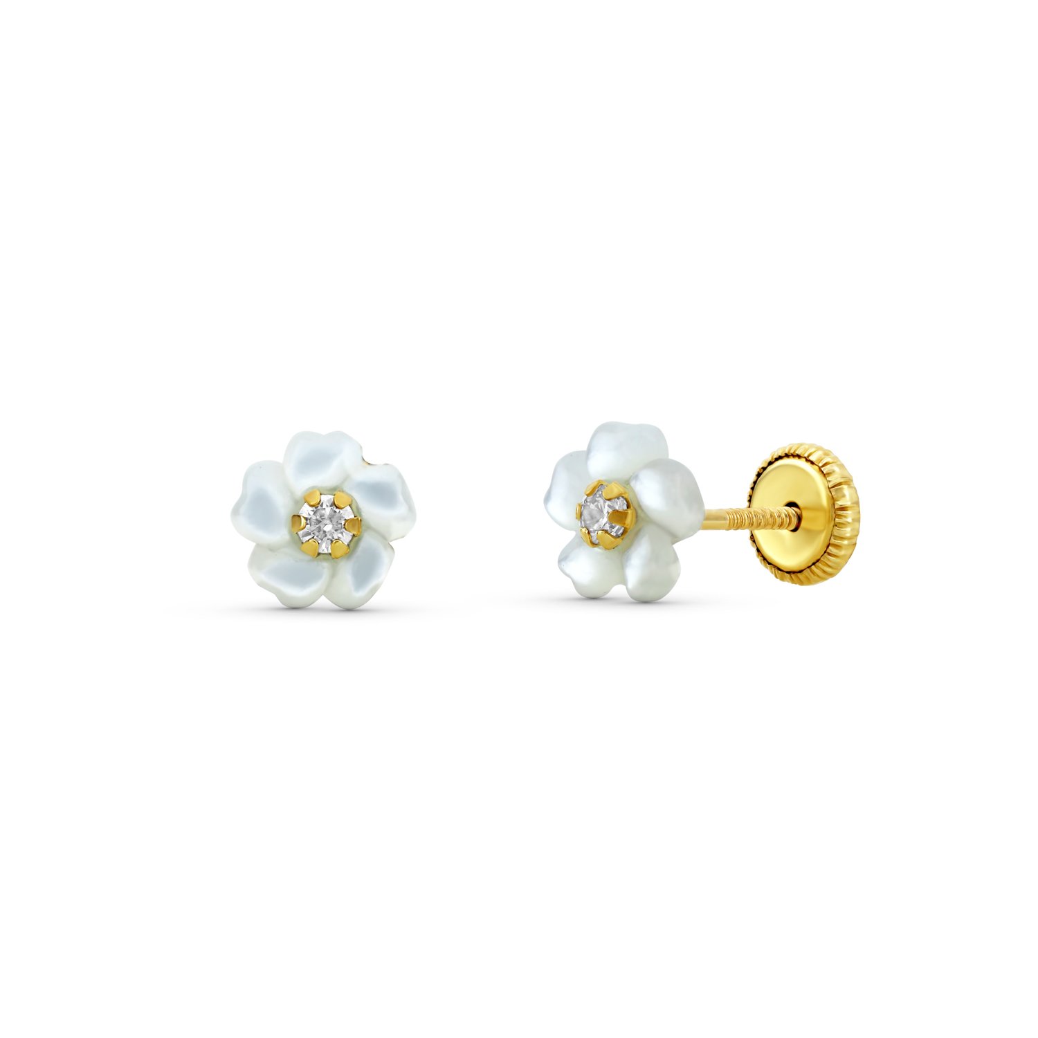 Pendiente flor con nacar y circonita 5mm oro 9kts cierre rosca